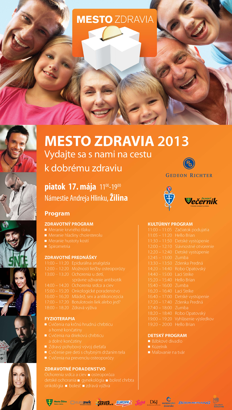 Unikátny projekt "Mesto zdravia 2013" prichádza tento rok aj do centra severozápadného Slovenska. Žilina sa môže pochváliť tým, že bude po Košiciach hneď druhým slovenským mestom, ktoré sa zapojí do rozsiahlej osvetovo - charitatívnej akcie. Záštitu nad ňou prevzal primátor mesta Igor Choma, personálne a odborne ju podporilo vedenie Fakultnej nemocnice s poliklinikou Žilina, no celkovú organizáciu a financovanie zabezpečila spoločnosť Gedeon Richter.
